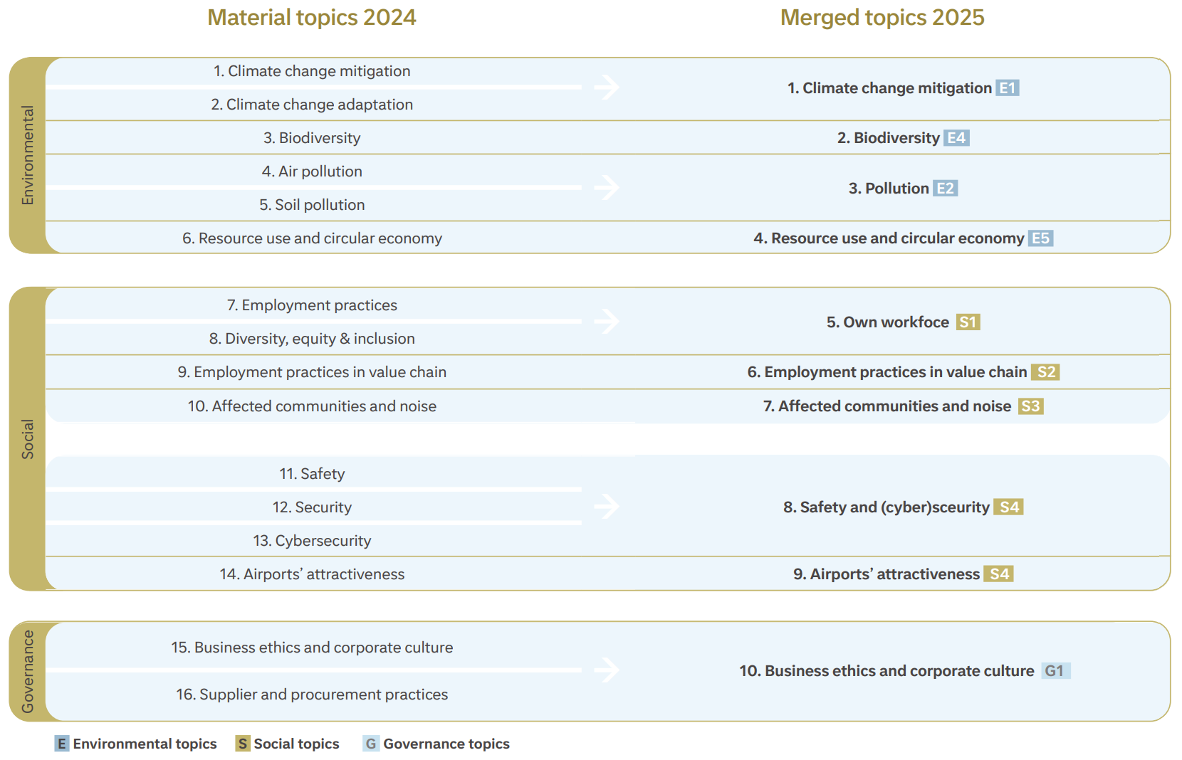The general vibe shift was behind the intentionality of assessing materiality staying largely the same between both FYs. In fact, in FY24, Schiphol described 2024 as the year the DMA was updated with specific intention to align with the CSRD, including stronger human-rights scoring and expanded related external stakeholder engagement. Still in FY25, Schiphol is now communicating that the DMA only received a light revalidation and update of the 2024 DMA, given no major changes in activity.