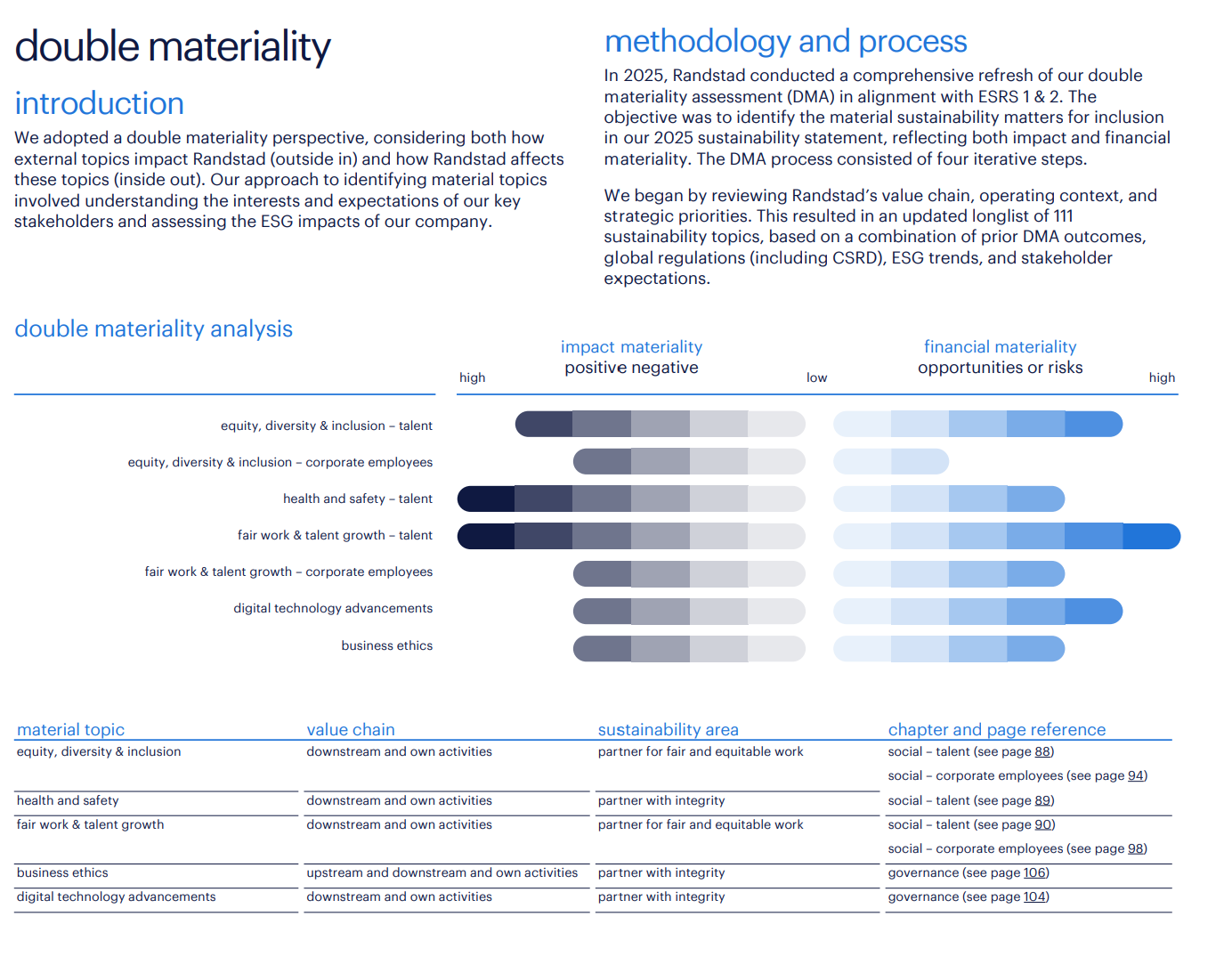 Environmental Materiality: For FY25, I can’t summarise it much better than they first paragraph of the environmental section… “Based on our 2025 double materiality assessment, we concluded that environmental topics are not material for Randstad. While the environment does not represent a material theme for our business, we recognize its wider importance and remain committed to responsible practices.” How would this impact actual reporting acitivities though?