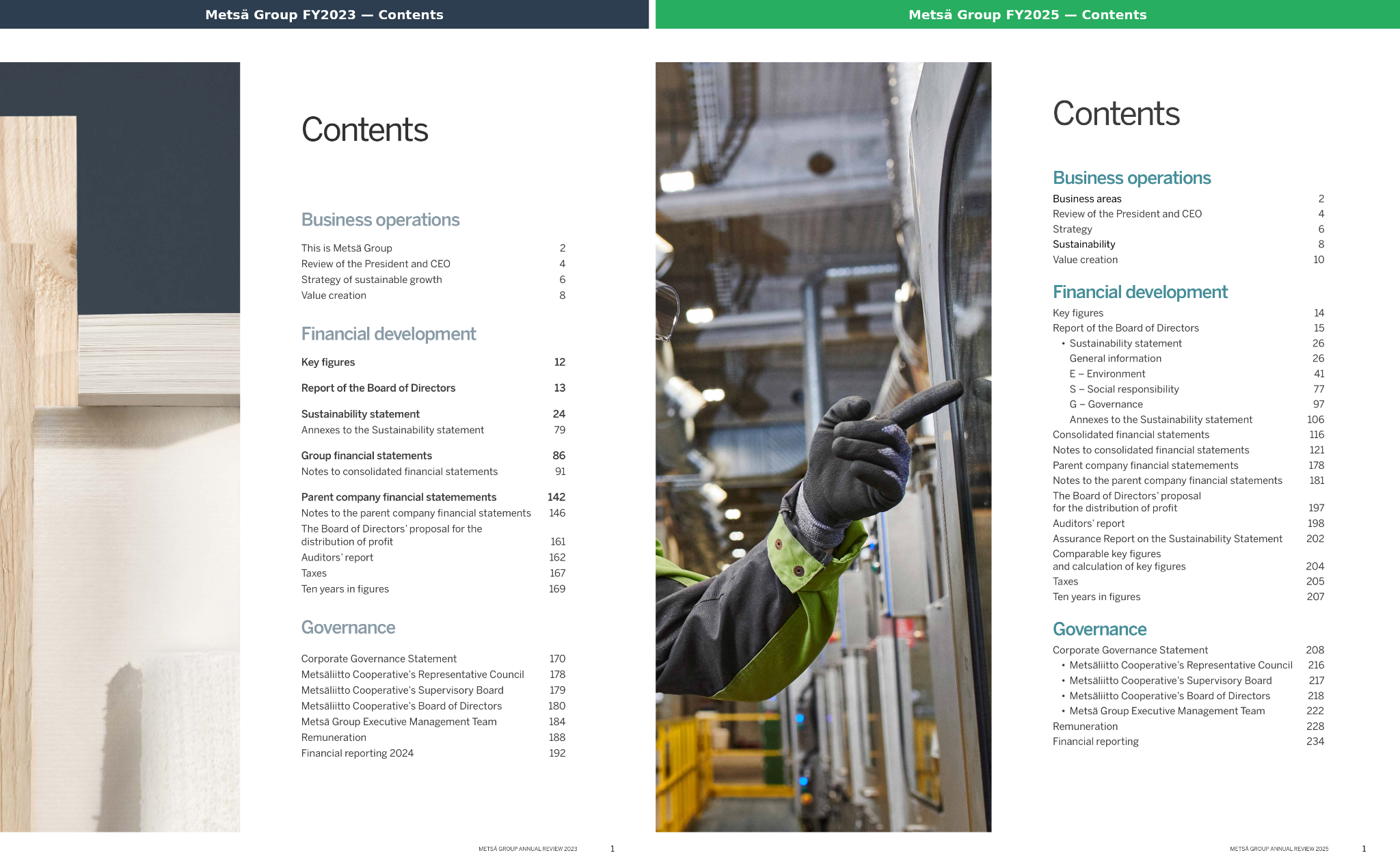 Example 1 — Metsä Group: Identical sustainability statement structure from FY2023 to FY2025. Both reports organise their sustainability statement under the same ESRS headings: General disclosures (p.24/26), E – Environment (p.41), S – Social responsibility (p.77), and G – Governance (p.97), with Annexes at p.79/106. The table of contents comparison below shows this continuity clearly: