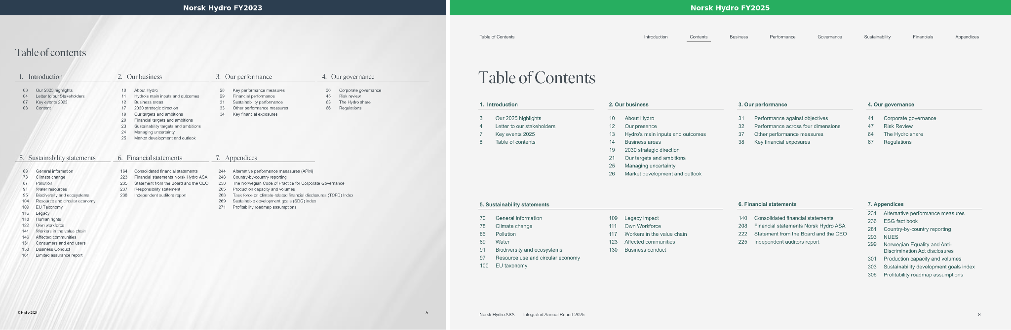 Example 2 — Norsk Hydro: Consistent ESRS topic architecture from FY2023 to FY2025. Hydro's FY2025 Integrated Annual Report retains the same sustainability statement structure established in FY2023. Both reports follow an identical sequence: General information, Climate change, Pollution, Water, Biodiversity and ecosystems, Resource use and circular economy, EU Taxonomy, Legacy, Human rights, Own workforce, Workers in the value chain, Affected communities, and Business conduct.